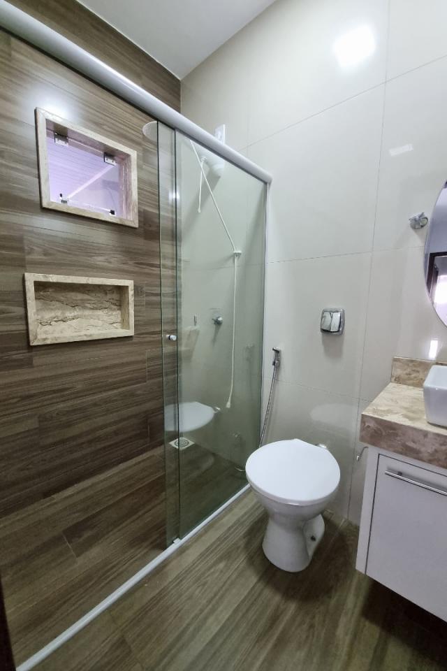 Casa com 03 quartos sendo 01 suíte com ar condicionado, sala com ar condicionado, cozinha com armários e coifa, banheiro social com armário, armário no banheiro suíte, lavanderia coberta, garagem coberta para 01 carro e espaço para mais carros.